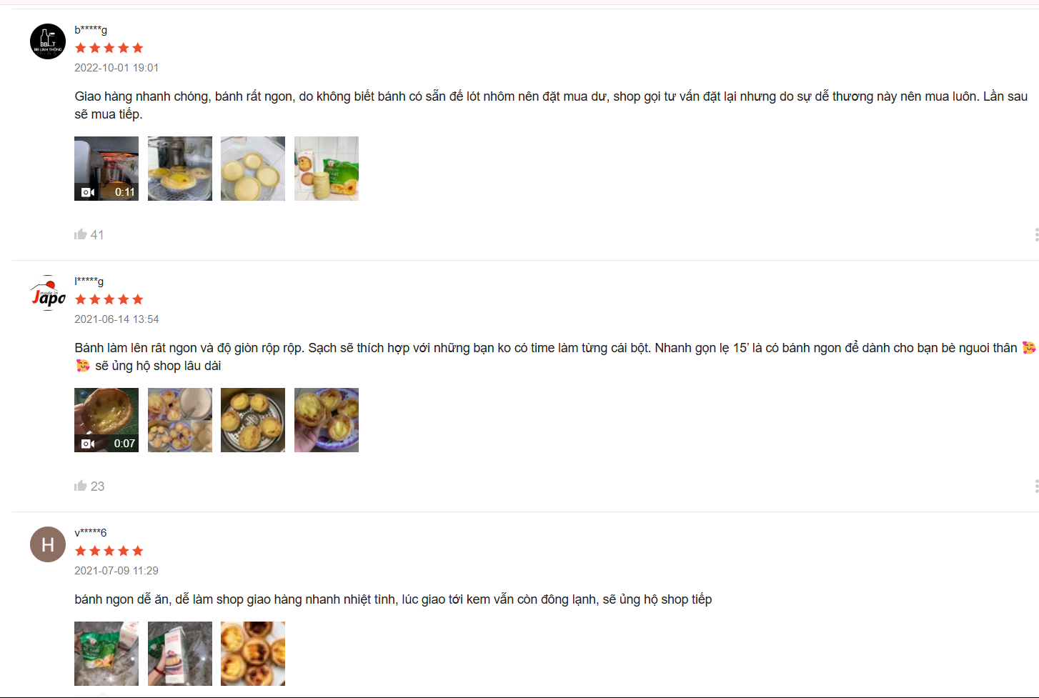 Thông tin sản phẩm: Tên sản phẩm: Combo Đế Bánh Tart Trứng và Kem Trứng Nhất Hương Khối lượng tịnh: 650gr ( 30 cái/ bịch) Khối lượng hộp kem trứng : 1 kg/ hộp Màu sắc: màu vàng nhạt Mùi vị: mùi thơm của trứng, không có vị lạ Trạng thái: dạng rắn Kích thước mỗi cái đế tart : chiều rộng : 8cm, chiều cao : 2cm, trọng lượng 1 cái : 20-22gr Thành phần: Bột mỳ (>50%), trứng gà, đường, nước, muối, dầu thực vật margarine Cách bảo quản : giữ đông ở nhiệt độ -18 độ C. Sau khi xả đông sản phẩm phải được giữ lạnh và sử dụng trong vòng 48 giờ. Xuất xứ: Việt Nam Hướng dẫn sử dụng: Lấy hết đế tart ra để hết tình trạng đông đá, sau đó cho kem trứng rót vào đế tart và cho vào lò nướng ở nhiệt độ lửa trên 200 độ C và lửa dưới 210 độ C trong thời gian từ 15-18 phút. Nếu là lò đối lưu thì nướng ở nhiệt độ 180 độ C trong thời gian 15-20 phút. Hạn sử dụng: in trên bao bì , 18 tháng/ giao hàng hạn sử dụng xa nên an tâm ạ HSD:2025