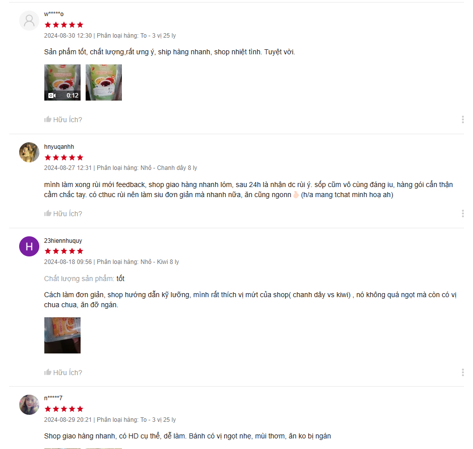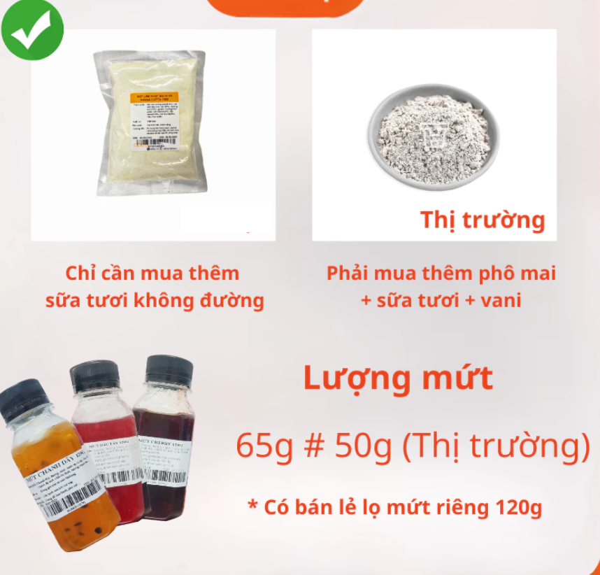 SET NGUYÊN LIỆU BAO GỒM: Set nguyên liệu panna cotta lớn 3 vị 25 ly bao gồm: - Bột panna cotta - Mứt dâu tây - Mứt việt quất - Mứt chanh dây - Bột gelatine Set nguyên liệu panna nhỏ các vị dâu, việt quất, chanh dây, xoài, kiwi cherry 8 ly bao gồm - Bột panna cotta - Mứt dâu/việt quất/chanh dây/xoài/kiwi/cherry - Bột gelatine Chuẩn bị thêm: Set to 25 ly: 1,5L sữa tươi không đường; 50g đường (tùy khẩu vị). Set nhỏ 8 ly: 500ml sữa tươi không đường; 15g đường Lưu ý phần mứt cũng sẽ có vị chua, ngọt nên phần pana cotta làm hơi nhạt thì ăn sẽ vừa hơn. Có thể trang trí thêm hoa quả tươi cho đẹp mắt hơn. Thành phẩm: set to 25 ly; set nhỏ 8 ly. Mỗi ly khoảng 70-75g Cả nhà nhớ để lạnh 3-4 tiếng cho panna cotta đông lại trước khi ăn để cảm nhận hết độ ngon nhé. Bảo quản được 3-5 ngày trong tủ lạnh, đậy kín nắp để tránh bị ám mùi từ thực phẩm khác. ƯU ĐIỂM CỦA SET LÀM PANNA COTTA NHÀ Làm Bánh Á: - Đóng gói combo tiện dụng, tiết kiệm thời gian - Kèm hướng dẫn cụ thể, dễ làm - Các nguyên liệu làm panna cotta được chuẩn bị sẵn với liều lượng phù hợp, giúp bạn tiết kiệm chi phí - Chất lượng đảm bảo: Nguyên liệu an toàn, đảm bảo VSATTP, thành phẩm thơm ngon và hấp dẫn BẢO QUẢN: - Hạn sử dụng: 4-6 tháng kể từ ngày sản xuất - Xuất xứ: Việt Nam - Thương hiệu: Làm Bánh Á - Đồ làm bánh, nấu ăn, pha chế - Cách bảo quản: Nơi thoáng mát, tránh ánh nắng trực tiếp. Mứt giữ lạnh sau khi mở. Set nguyên liệu làm Panna cotta của Làm Bánh Á là lựa chọn hoàn hảo cho những ai yêu thích tự làm panna cotta tại nhà. Với set làm panna cotta này, bạn sẽ có mọi thứ cần thiết để tạo ra những ly panna cotta thơm ngon, đúng vị. Trải nghiệm set panna cotta để tận hưởng hương vị panna cotta đậm đà, dễ làm và tiện lợi. Làm Bánh Á luôn đem đến cho bạn những sản phẩm chất lượng: - Nguyên liệu sạch - Đạt chuẩn an toàn vệ sinh thực phẩm với đầy đủ giấy tờ kiểm định. - Không sử dụng chất bảo quản, không chất tạo màu. - Màu sắc tự nhiên, hương vị nguyên bản Trong quá trình giao nhận hàng, nếu sử dụng sản phẩm có vấn đề gì, quý khách vui lòng liên hệ trực tiếp Làm Bánh Á qua phần chat nhé ạ!