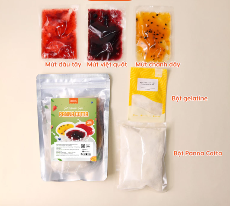 Set làm Panna Cotta nguyên liệu làm bánh vị dâu, chanh dây, việt quất - Set nhỏ 8 ly